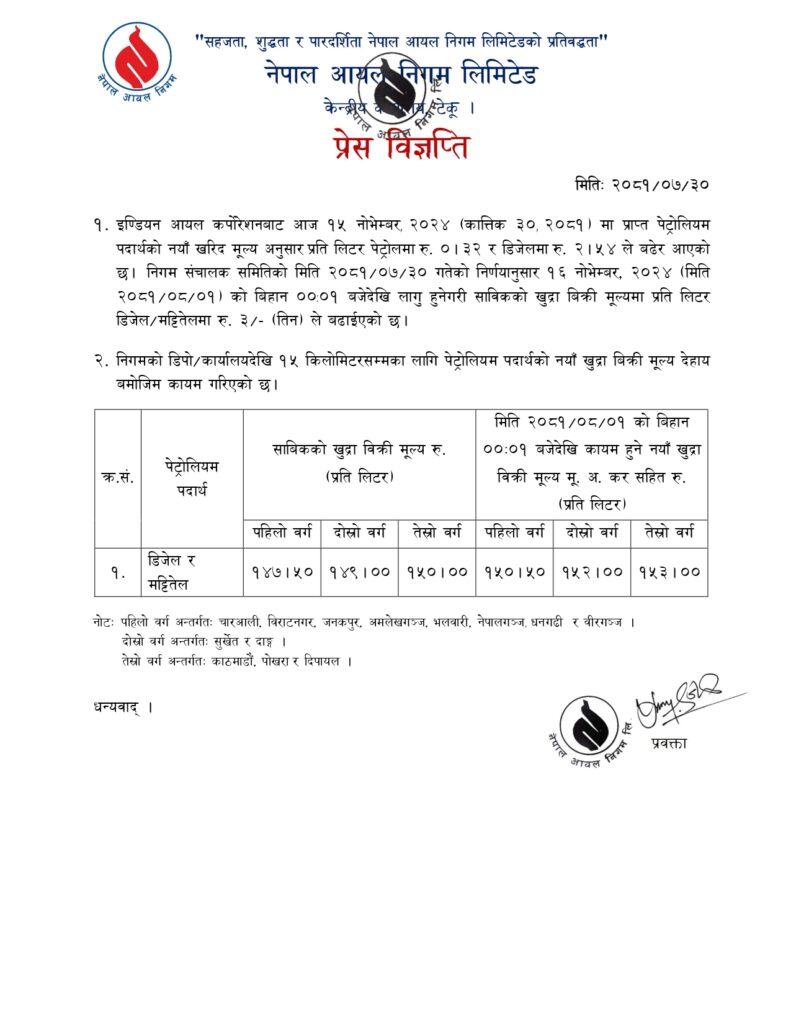 काठमाडौँ। नेपाल आयल निगमले पेट्रोलियम पदार्थको मूल्य वृद्धि गरेको छ । आज राती १२ बजेदेखि लागु हुने गरी डिजेल र मट्टितेलमा प्रतिलिटर तीन रुपियाँले वृद्धि गरेको सूचना मार्फत जानकारी गराएको छ ।